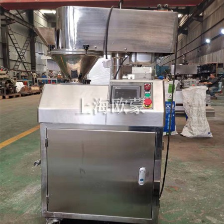 本機(jī)有送料機(jī)構(gòu)、壓片機(jī)構(gòu)、液壓機(jī)構(gòu)、機(jī)架和電氣控制等部件組成,送料,壓片、制粒均采用變頻無(wú)級(jí)調(diào)速,油泵壓力可調(diào),成品細(xì)度可以通過(guò)更換不同的篩網(wǎng)獲得。改進(jìn)制粒轉(zhuǎn)籠,增加了顆粒的成品率。本機(jī)裝拆、清洗方便,與物料接觸部分皆為不銹鋼制作。產(chǎn)品符合GMP要求。物料由頂部送料漏斗加入,經(jīng)兩壓輪強(qiáng)制擠壓成片狀后進(jìn)入下部制粒室,在制粒室中片狀物料被制粒刀片打碎,然后進(jìn)入整粒室,直至顆粒小于或等于網(wǎng)孔徑,顆粒通過(guò)網(wǎng)篩到盛料托盤(pán)。所需要顆粒大小可以通過(guò)調(diào)整篩網(wǎng)大小來(lái)決定。
